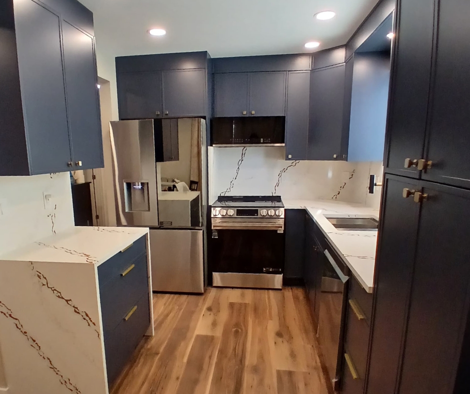 Explore our wide selection of granite, quartz, and marble countertops along with custom cabinet designs.